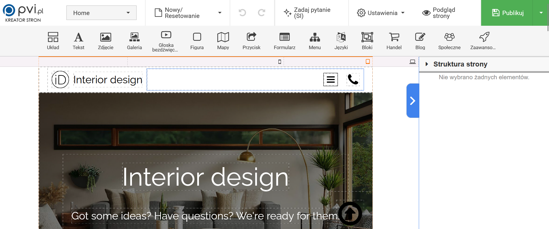 Widok kreatora stron po prawidłowym zalogowaniu się :