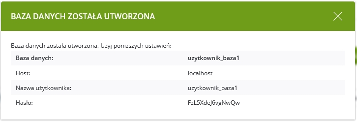 Kliknij przycisk "Utwórz nową bazę danych". W formularzu uzupełnij nazwę bazy, wpisz hasło do bazy lub wygeneruj je przy pomocy przycisku znajdującego się z lewej strony pola z hasłem a następnie kliknij przycisk Utwórz bazę danych.